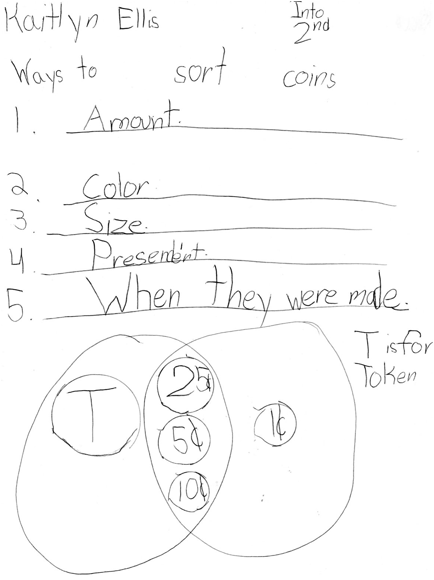 Clinical Interview 1, Clinical Interview 2 Clinical Interview 1: Venn Diagram Target Age Group; 2nd Grade Information to Discover through Interview: As I begin this interview, I chose this misconception activity to know if the student has a basic knowledge of being able to sort different coins by their attributes. These include value of the coins, color, size, what presidents are on the face of the coins, how old they are, and whether they are real coins or not. As the interview continues with opening questions, I want to also discover whether the child knows where they make these coins and to give me a brief explanation of what a Venn Diagram is and how it works. Materials: Interview Questions & Answers: Q: What do you know about Venn Diagrams? Q: Tell me what is the difference of value of each of the above coins? Do they have different value or all the same? Q: Why does the smallest coin hold the most value? Q: Can we use these coins in other countries? Q: Can you tell me what each coin is worth? Q: What can you tell me about the token? Potential Misconceptions Related to GEMS Guide: As I concluded the interview, I asked several questions that I thought would be geared toward finding out whether the student had a basic knowledge on the attributes of the coins as well as knowing how to sort the coins. This interview also allowed the child to give me a basic idea of where they stand in relation to their mathematical skills. As Kaitlyn explained to me why certain coins are made the way they are, some misconceptions were stated. For example, her conception that the coins where made by different companies led me to believe that she probably thinks that each coin is individually made at a different company. She constructed this knowledge based through experiences knowing that there are so many companies in the world, and so each coin is made at one company since they are all different. Another misconception could be that the “tokens” could not be real at all because they were too big. In relation to previous lectures, this is due to the fact that children’s conceptions explain what they observe in their daily lives. Knowing that she is not familiar with the “token–size” makes her believe that it could not be real because she is not used to seeing it daily. I uncovered the child’s thinking by having her write down 5 ways to sort coins by and to draw her own Ven Diagram. When the child filled in the Venn Diagram, she chose to put the tokens on one side, pennies on the other side and all the rest of the coins in the middle. Further Questions:
